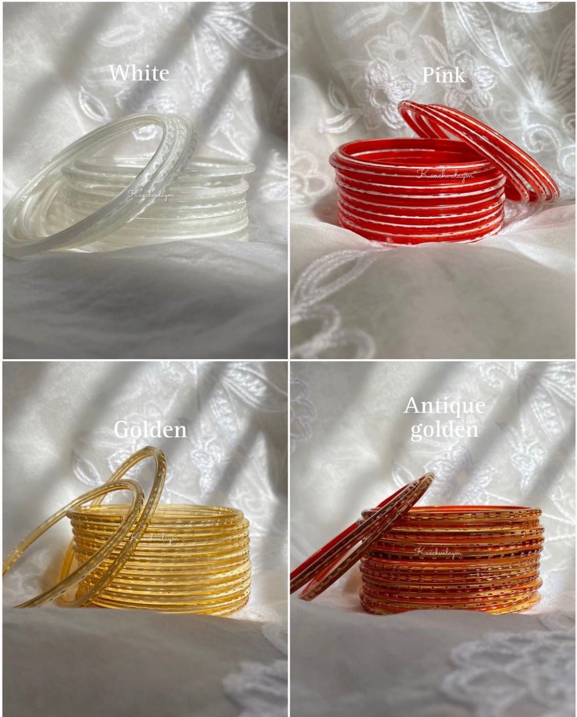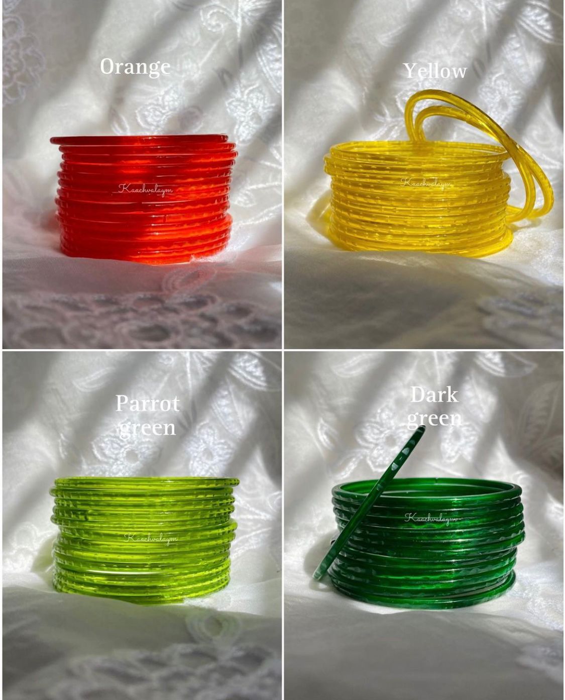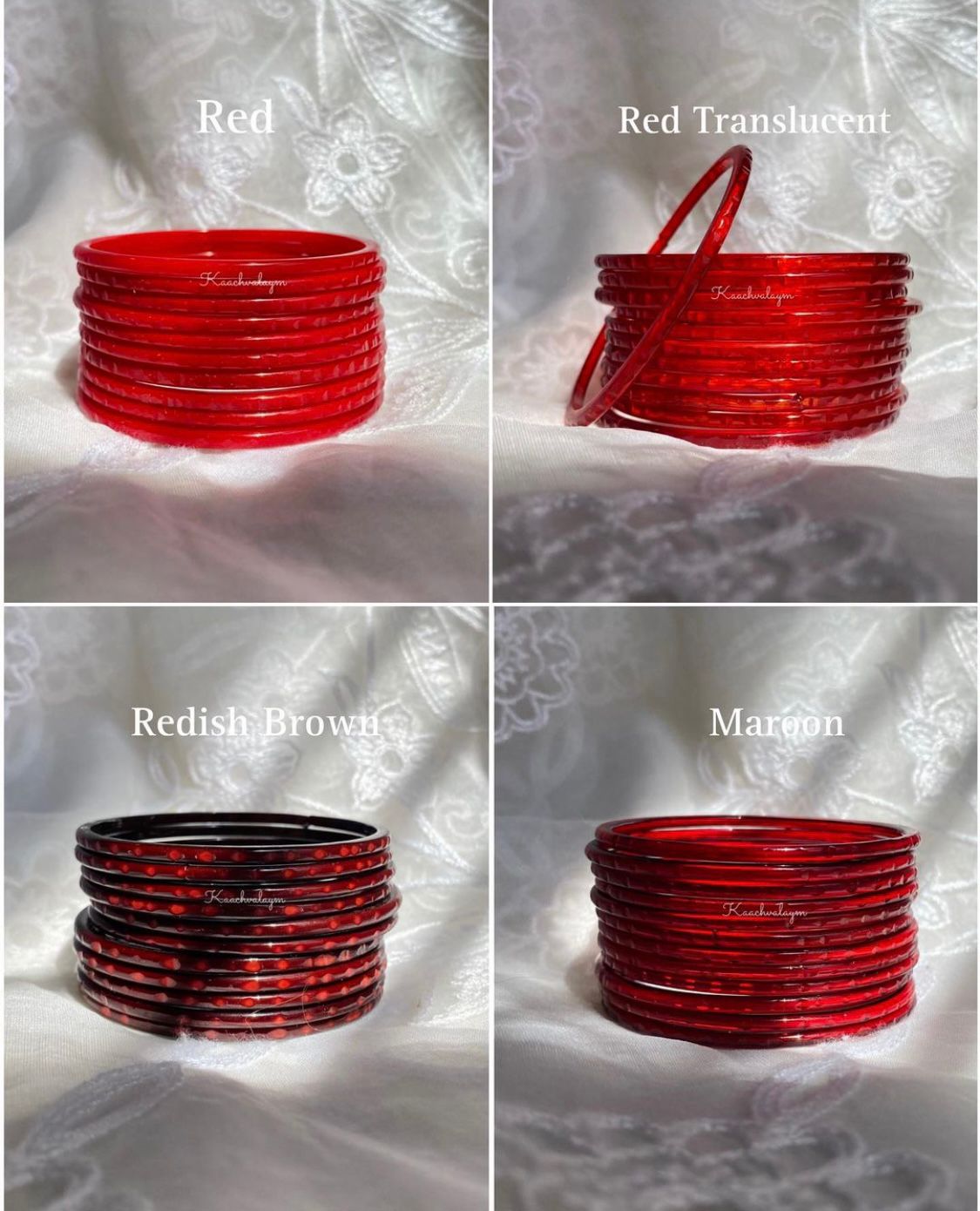 Glass cut bangles available in 16 vibrant shades, per dozen.