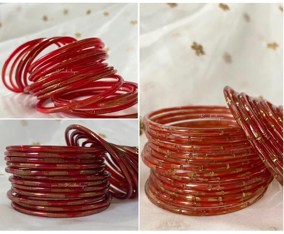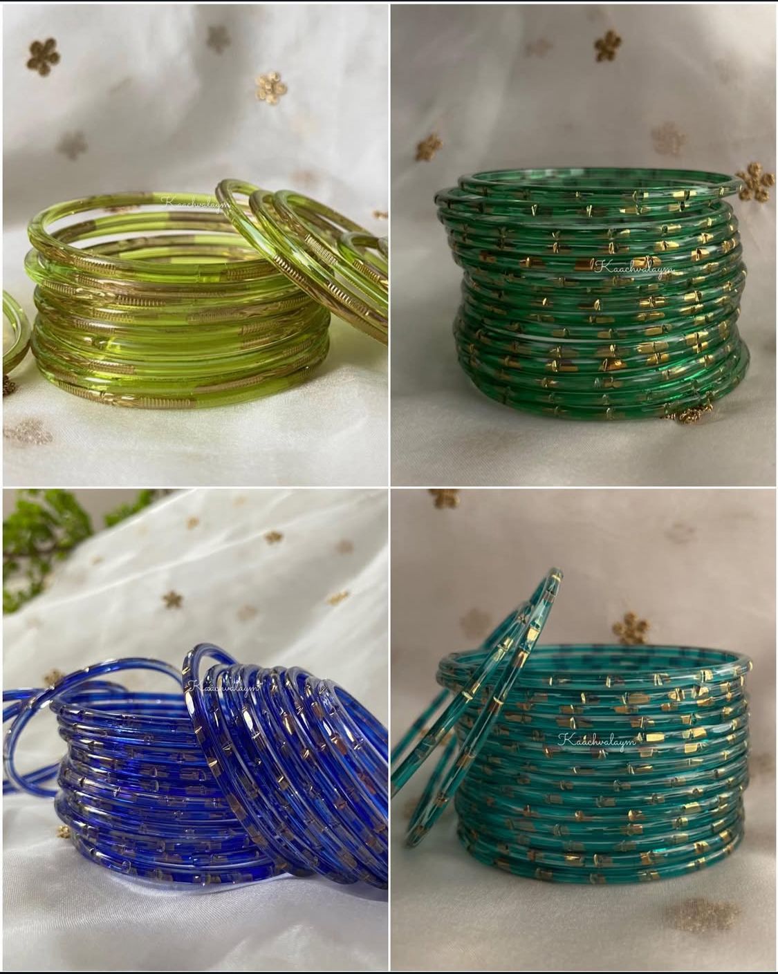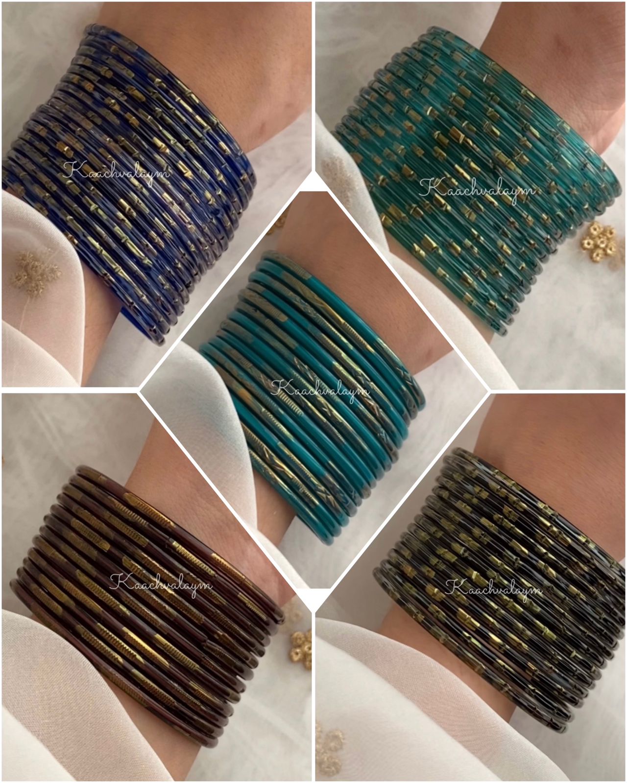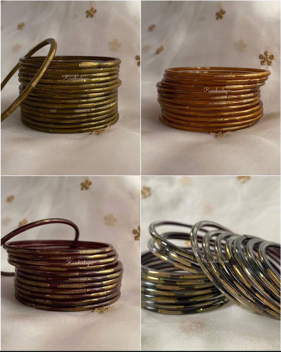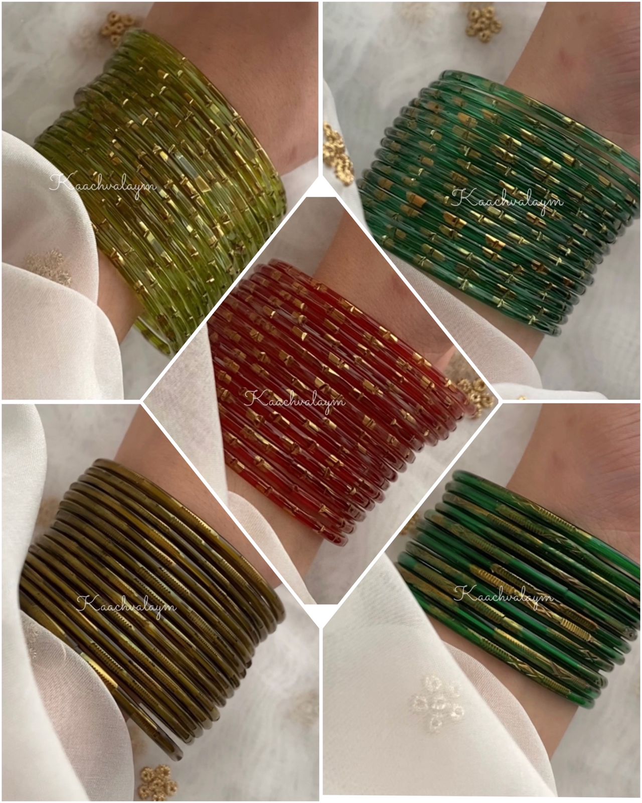 Pakki Hill Meena Bangles with gold work in 13 different shades. Dhani, Translucent Green, Dark Green, Olive, Light Brown, Translucent Red, Red, Maroon, Egyptian Blue, Translucent Teal, Radium, Plum, Black