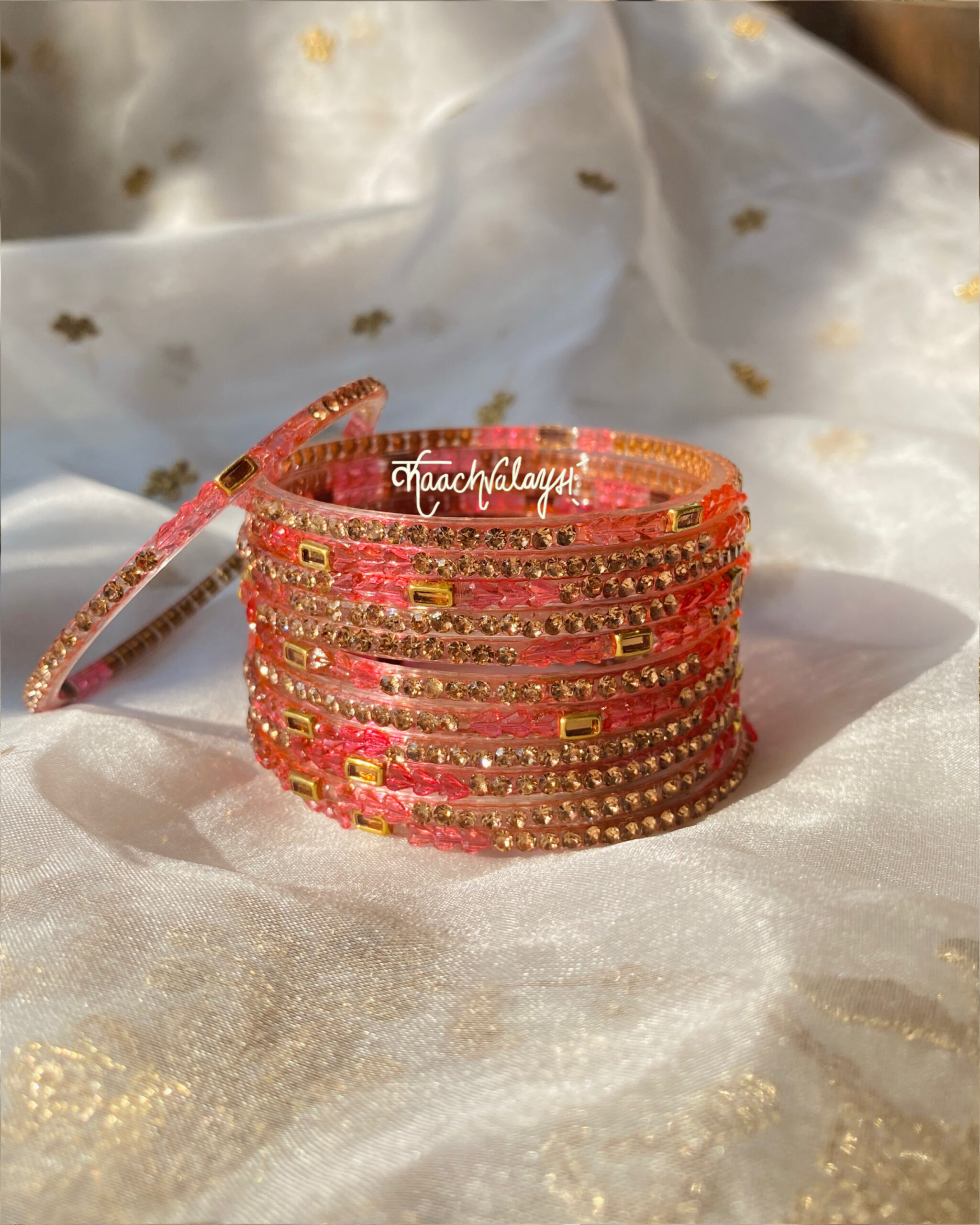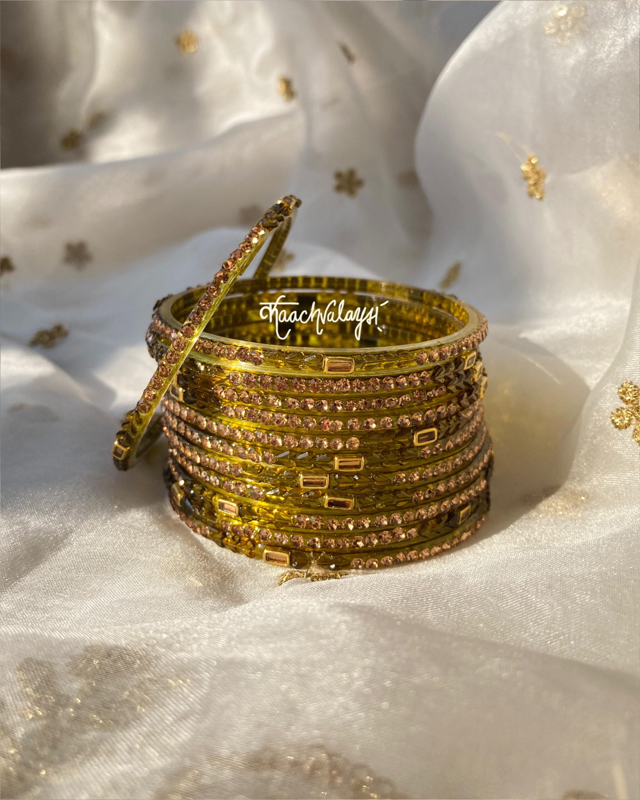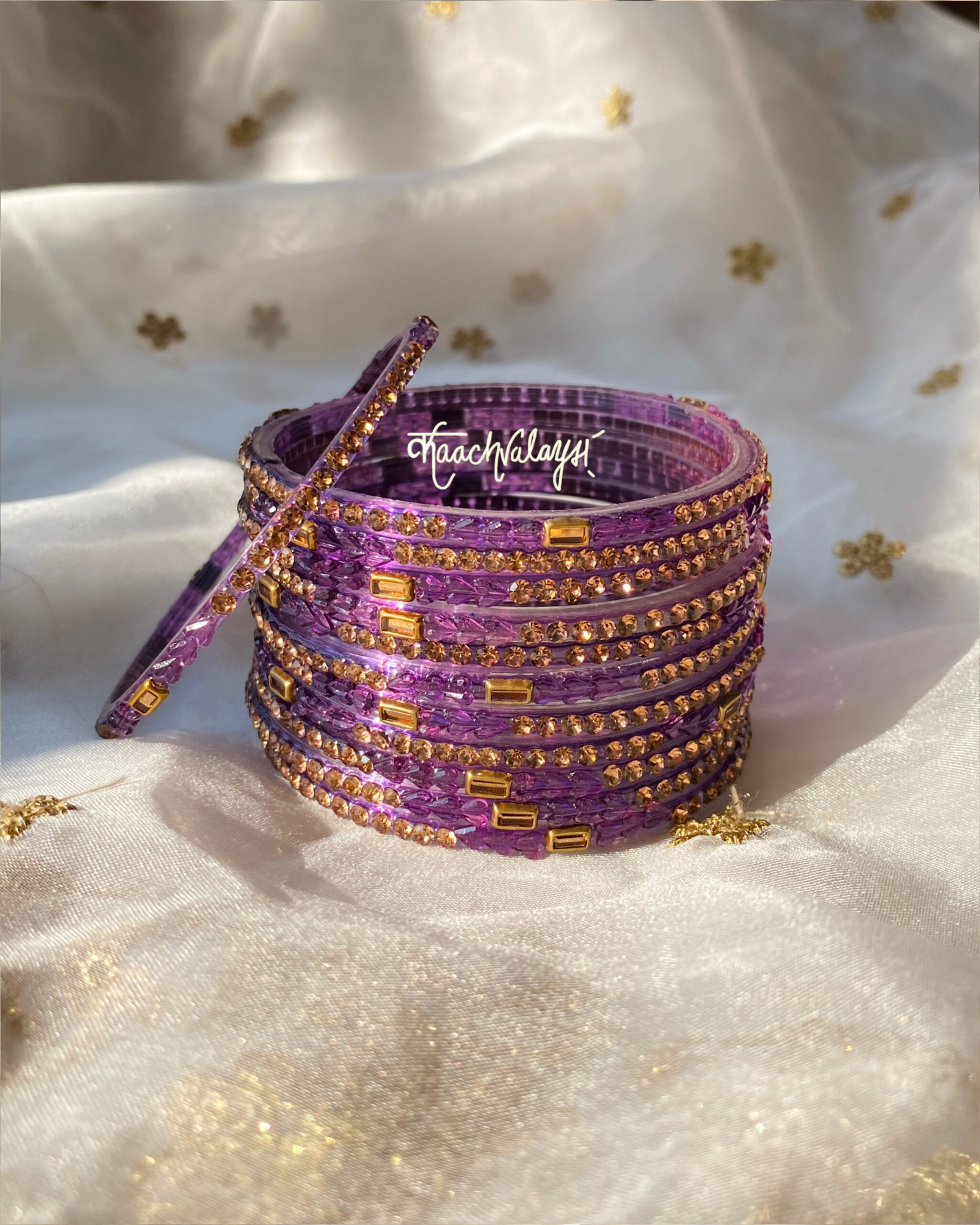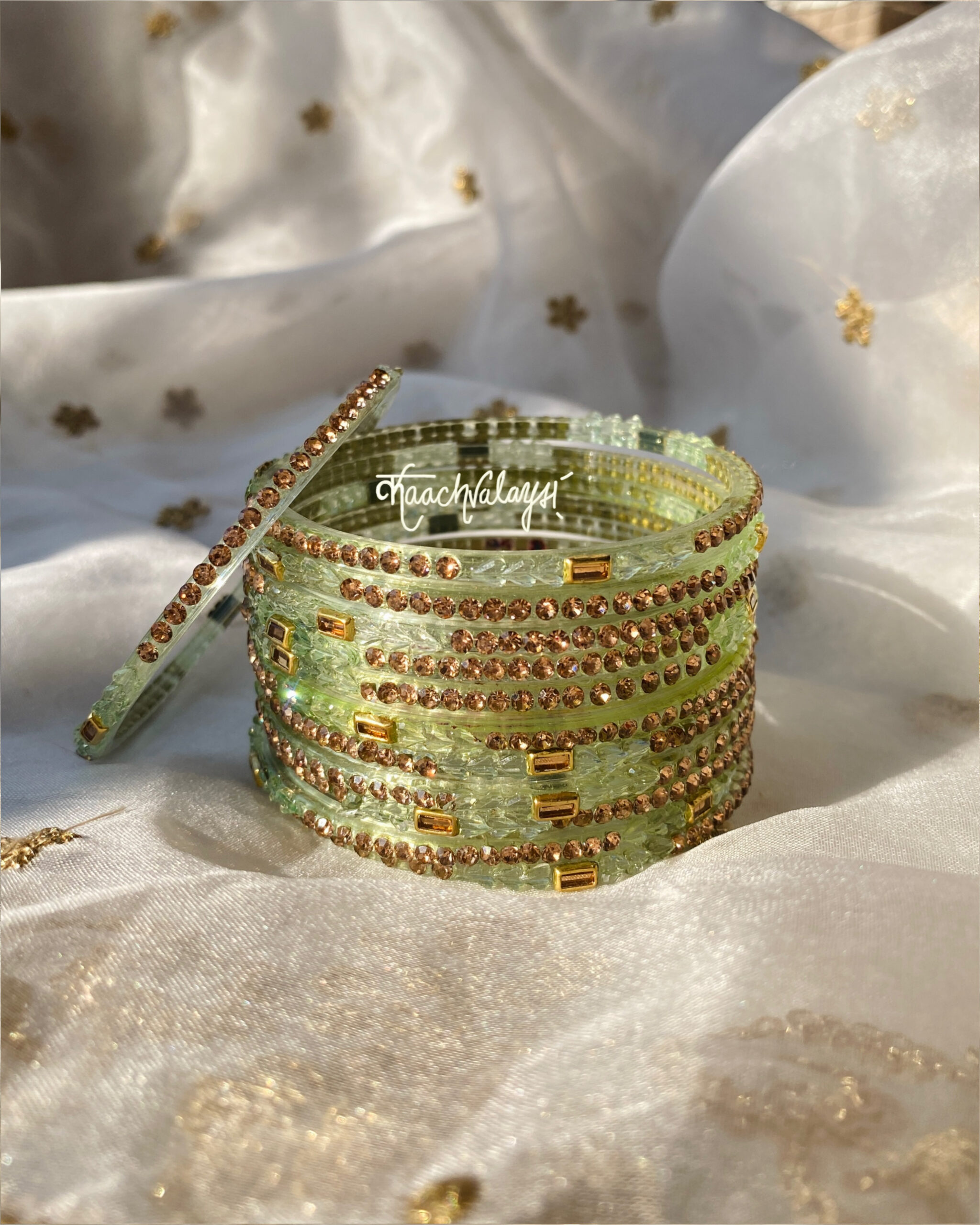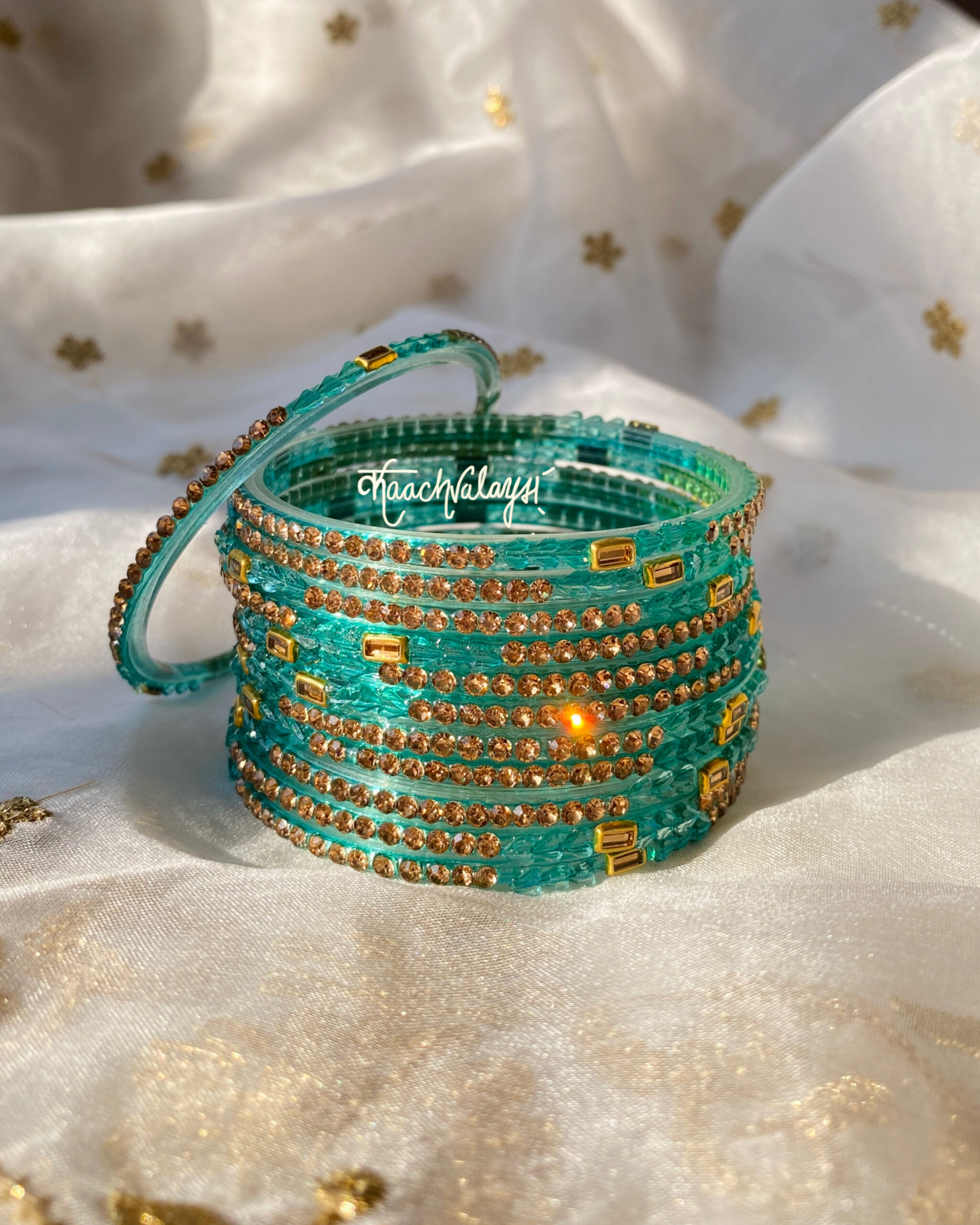 Khwab bangles in 10 mesmerising shades, embellished with intricate zircon and stone work.