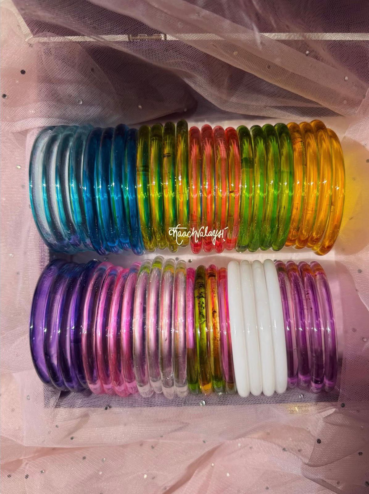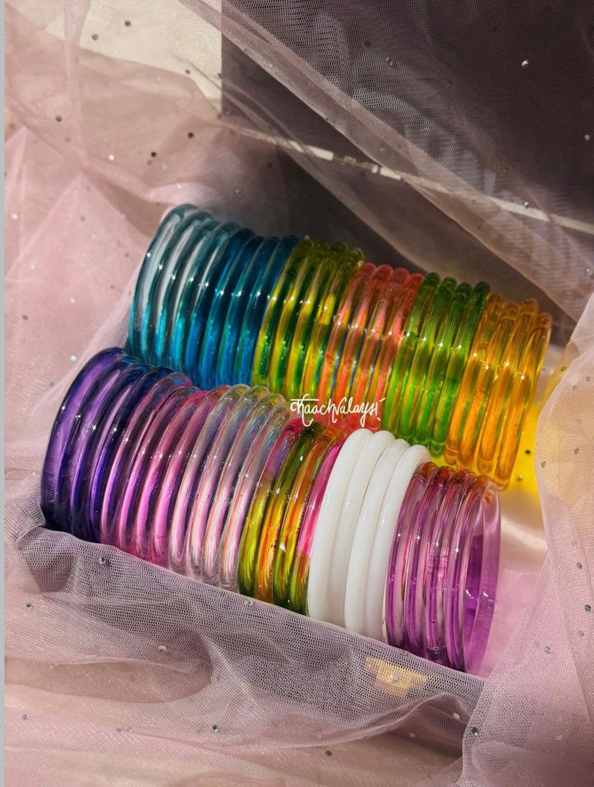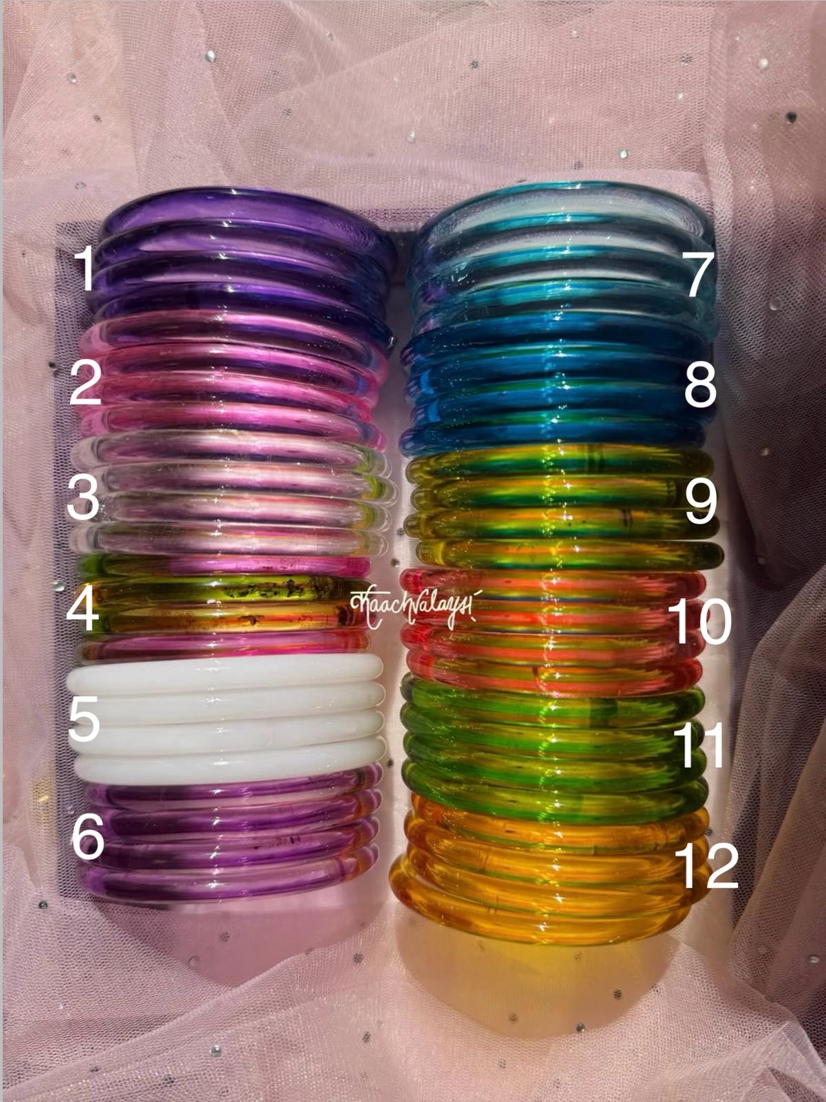 1 Jamuni, 2 Pink, 3 Translucent, 4 Light Multicolor, 5 White, 6 Purple, 7 Surf, 8 Firozi, 9 Dhani, 10 Carrot, 11 Pista Green, 12 Yellow